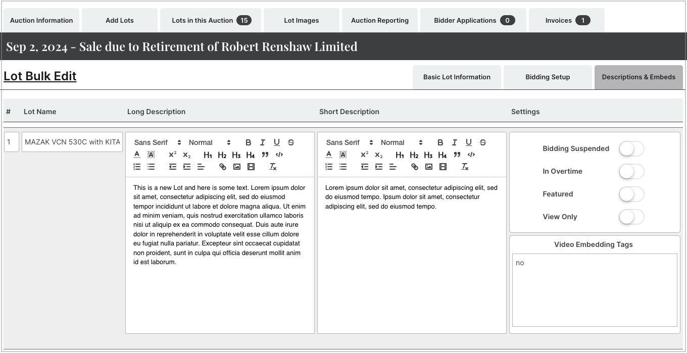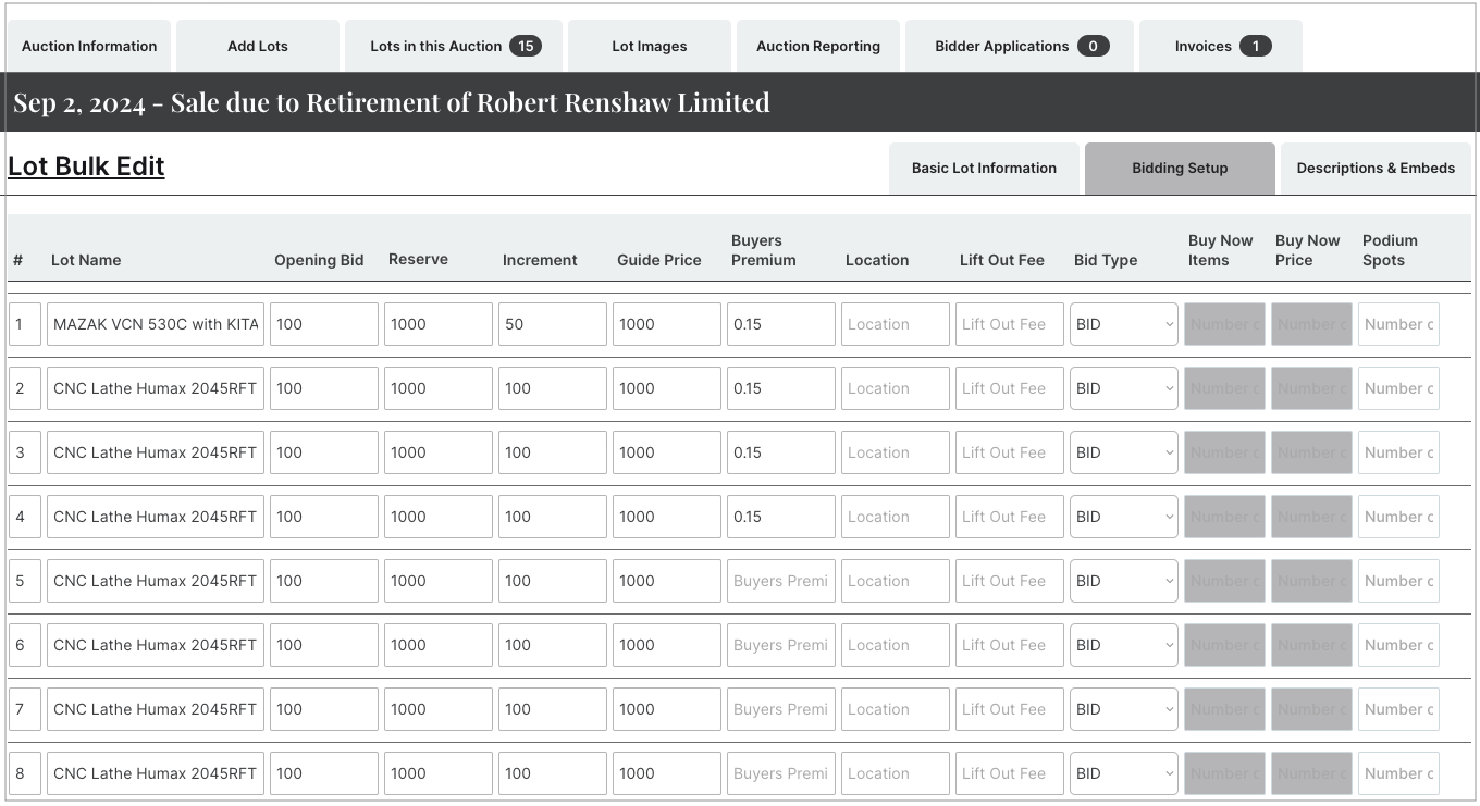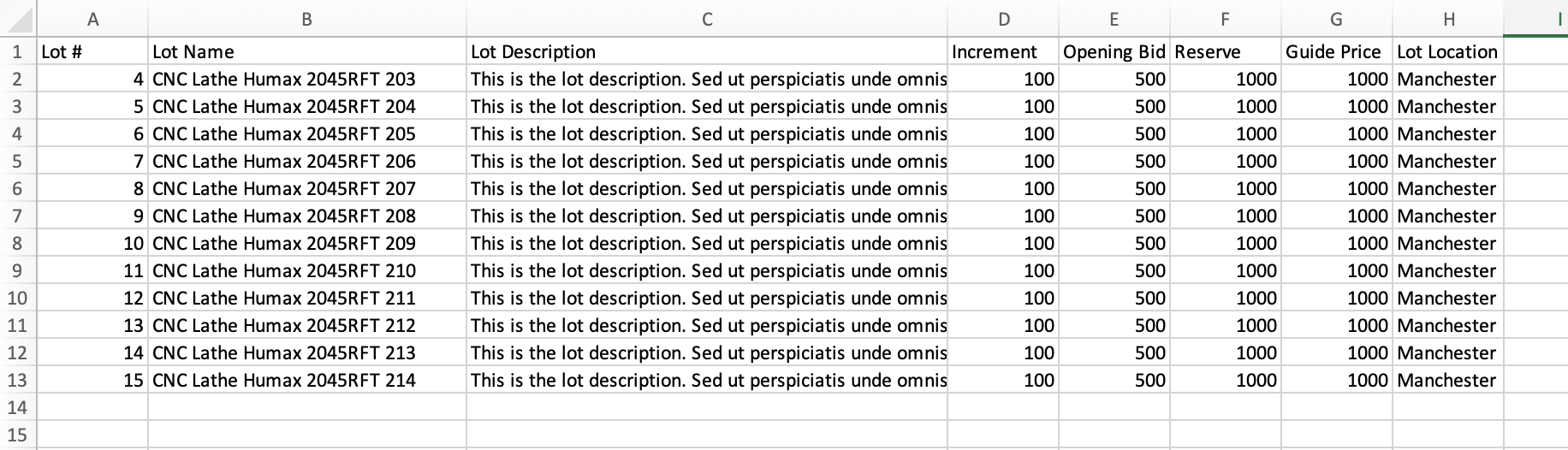 You can very quickly get a spreadsheet full of lots added to your system using the Excel above. At this stage you need to think about the start and end dates for the auction, because these can be change easily in the auction placeholder.